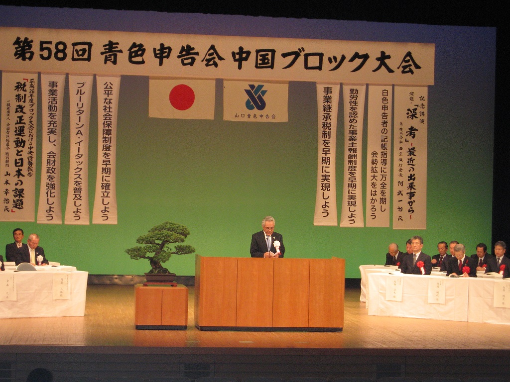 る平成26年10月15日(水)13時30分から山口県山陽小野田市文化会館において第58回青色申告会中国ブロック大会が開催され、わが(一社)納税相談センター尾道青色申告会からは25名ほどの会員・職員が参加いたしました。大会では、大西淳也広島国税局長をはじめ、藤部秀則山口県知事代理・中村 聡山陽小野田市市長代理・小倉國雄中国税理士会会長代理の来賓祝辞を頂き、続いて感謝状授与式があり当会にも授与されました。さらに全青色特別顧問による「中央情勢報告」があり休憩をはさみ、埴生芝居「勧進帳」を鑑賞し、元西京銀行会長・下松市議会議員阿武一治氏による記念講演【「深考」最近の出来事から】と続き、ブロック大会決議、次回開催地を広島県呉市と決し、17時00分に盛会裡に閉幕いたしました。