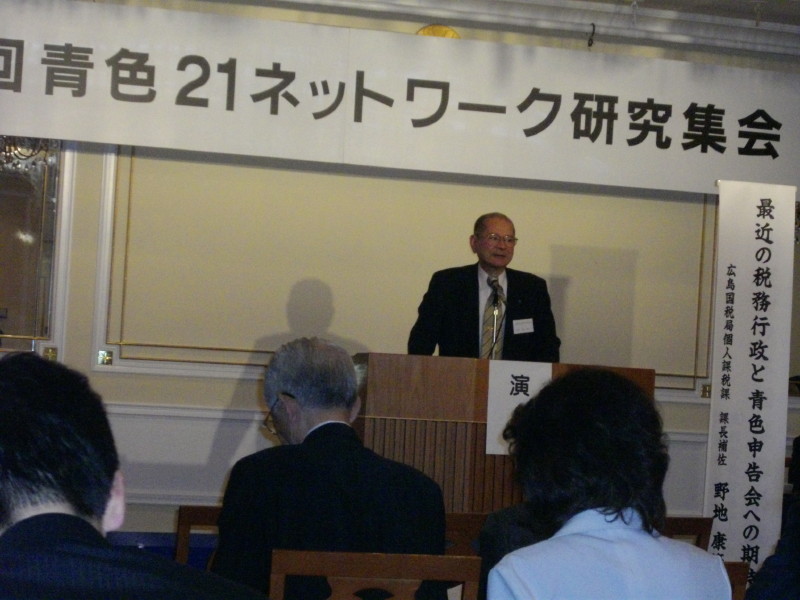 研修では吉田文一特別顧問が《これからの青色申告会活動》と題して講演がり、また担当青申会からはe-Taxへの取り組み方や指導結果報告等があり、研修後の特別講演においては前国税庁長官で日本損害保険協会副会長の福田進氏を講師に招き《財政と税制》をテーマに行われました。有意義な実りのある研究集会でした。